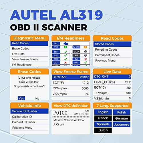 【EXTENSIVE APPLICATION】 Autel AL319 Compatible with 7 languages (English, French, Spanish, etc.) and various post-1996 OBD II protocol vehicles (Toyota, Nissan, Honda, Ford, etc.), this OBD II scanner provides accurate and fast diagnosis for worldwide car owners.