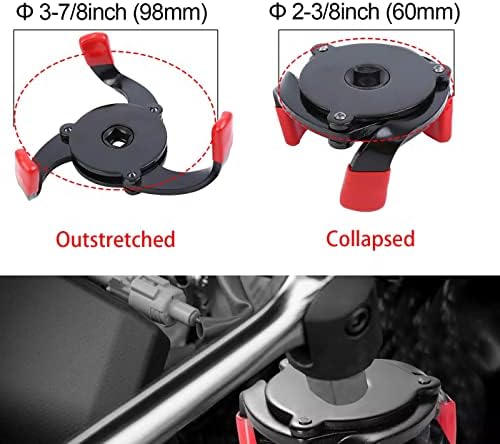 Universal Tool – This oil filter removal tool fits oil filters ranging from 60mm to 98mm (Oil filters Range 2-3/8 inch to 3-7/8 inch). A removable 3/8-inch reducer is available for larger clearance and can be used with a 3/8-inch square drive tool.