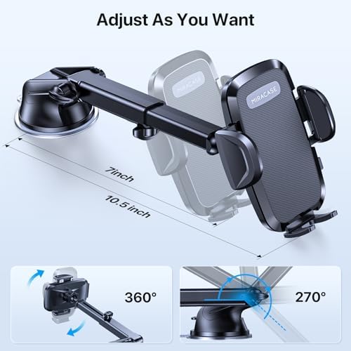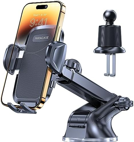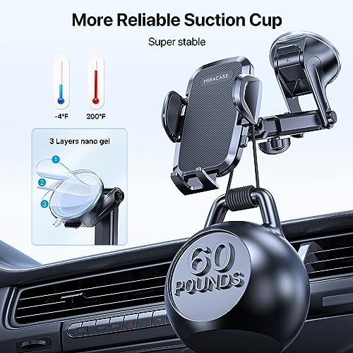 ✅ [ SUPER SUCTION CUP, ABSOLUTELY STABLE ] The mount uses upgraded super suction cups and high temperature resistant gel, Miracase car phone mount will provide extremely strong suction to safely stick to dashboards, windshields and other flat surfaces, or by using the latest third generation metal double hooks, mounted on car vents, all to protect your phone from falling off even in extremely harsh environments. It can be easily removed by pulling the suction cup or twisting the knob,no trace.