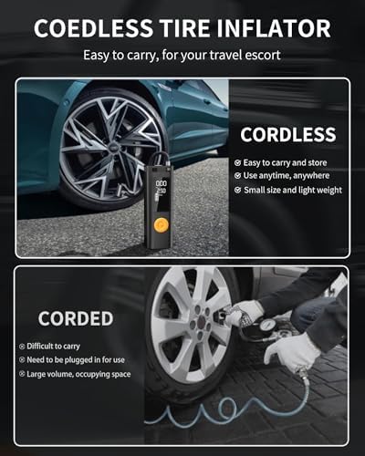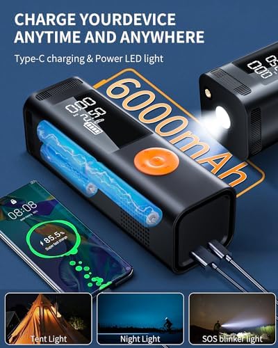 🛵【Precise Air Pressure Measurement Function】This portable air compressor uses a high-performance sensor to accurately measure air pressure. The auto-stop function prevents over-inflation, thus prolonging the life of your tires. It is the best choice for inflating your car or motorcycle. Equipped with 6000mAh high capacity battery, it can be used for a long time. Short charging time, long use time, also can be used as emergency power lighting