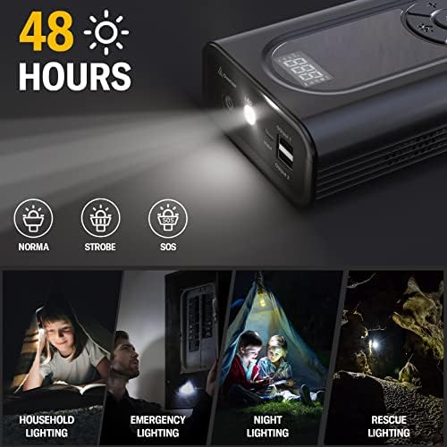 【FLASHLIGHT AND PORTABLE POWER SUPPLY】The 400 lumen LED light of the lithium battery booster includes three modes (normal, strobe, SOS). Not only that, it can be used as a portable power bank to charge your digital products (such as mobile phones, computers and watches, etc.), and the jump box supports 48 hours of high-brightness lighting.